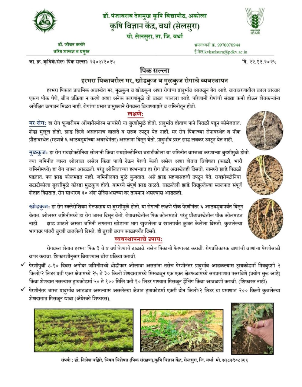 हरभऱ्यावरील मर, खोडकूज व मूळकूज रोगाचे व्यवस्थापण